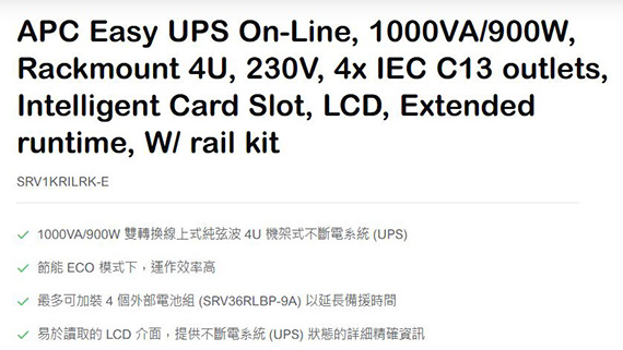 APC SRV1KRILRK-E Easy UPS SRV 1000VA RM 230V 4U機架式 在線式不斷電系統