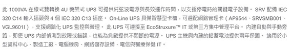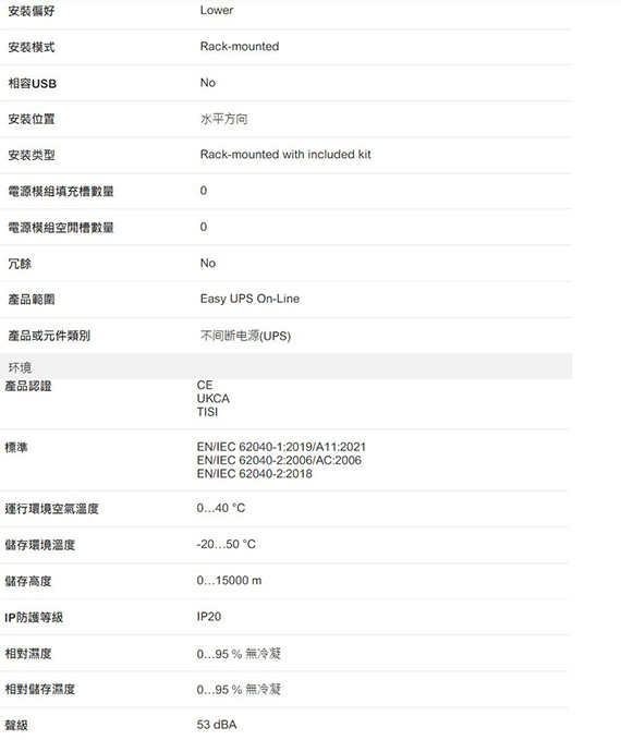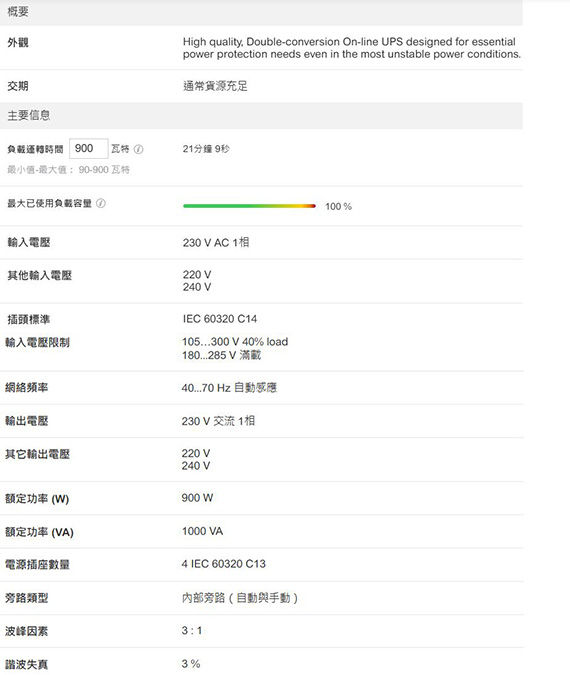 1000VA/900W,輸出電壓230V交流,輸出頻率50/60Hz+/-3Hz與市電同步,電源插座數量:IEC 60320 C13*4,正弦波,功率因數為:0.9PF,內建自動與手動旁路,具備智慧型卡槽,可配置220、230或240額定輸出電壓,節能ECO模式,最多可加裝4個外部電池組,易於讀取的LCD介面,IP20防護等級,27.1kg,3年主機、2年電池保固