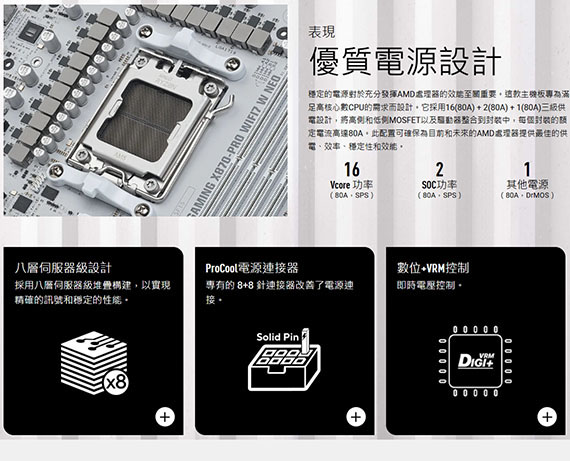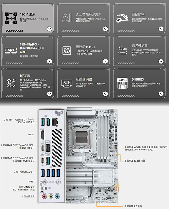 AMD X870,4*DDR5 max256GB,1*PCIe 5.0 x16 slot,2*PCIe 4.0 x16 slot,4*M.2,2*SATA 6Gb/s,1*HDMI,2*USB4 Type-C, Realtek 5Gb Ethernet,Wi-Fi 7,Realtek ALC1220P 7.1,8*Type-A,ATX Form Factor需搭配CPU晶片才能使用內顯功能