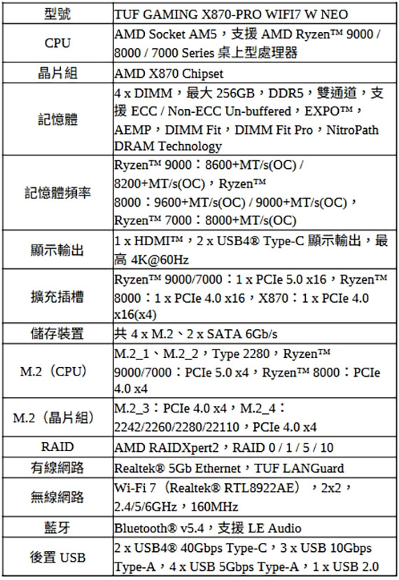 TUF GAMING X870-PRO WIFI7 W NEO |