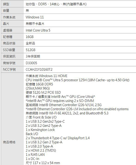 Intel Core Ultra 5 processor 125H,16GB DDR5,512G M.2 PCIE SSD, Wi-Fi 6E,Bluetooth 5.3,Gigabit,介面(前):1xType-C USB 3.2 Gen2x2,2xType-A USB 3.2 Gen2,1 x Kensington Lock,介面(後):2 xType-C Thunderbolt 4 w/DisplayPort 1.4,1xType-A USB 3.2 Gen 2,1xType-A USB 2.0,2 x HDMI 2.1 (TMDS),1 x RJ45 LAN,1 x DC-in,尺寸:117 x 112 x 54 mm,Windows 11家用版64位元