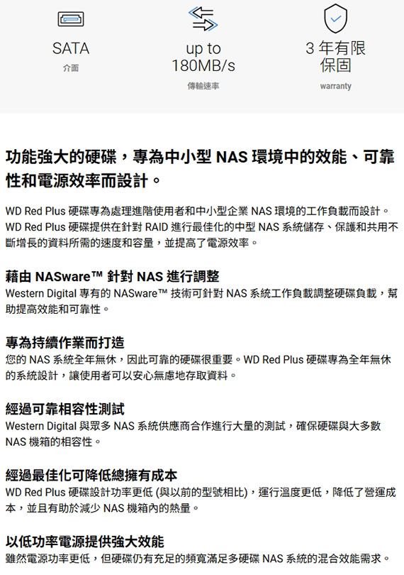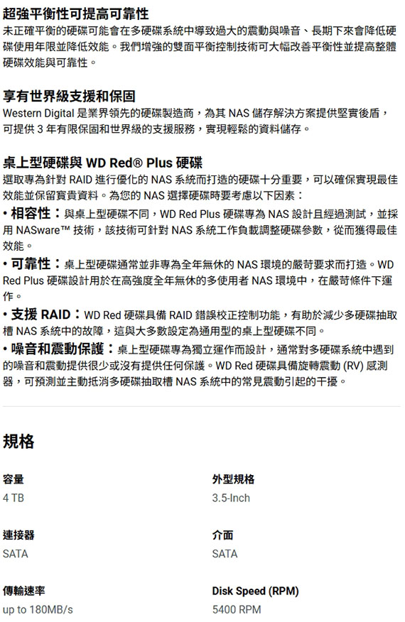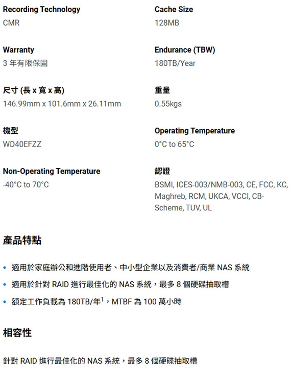 3.5-Inch,SATA,轉速:5400RPM,128MB快取記憶體,傳輸速率up to 180MB/s,噪音和震動保護,RAID錯誤校正控制功能 BSMI認證碼: D3E024