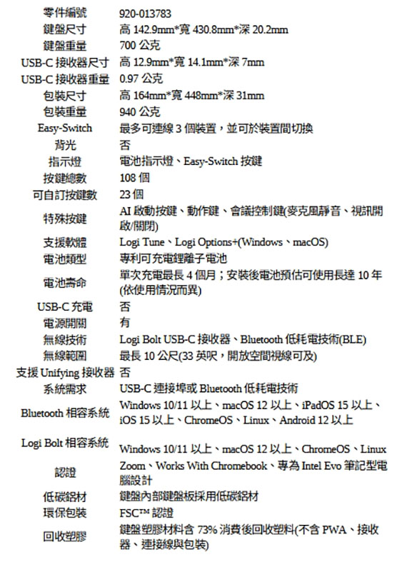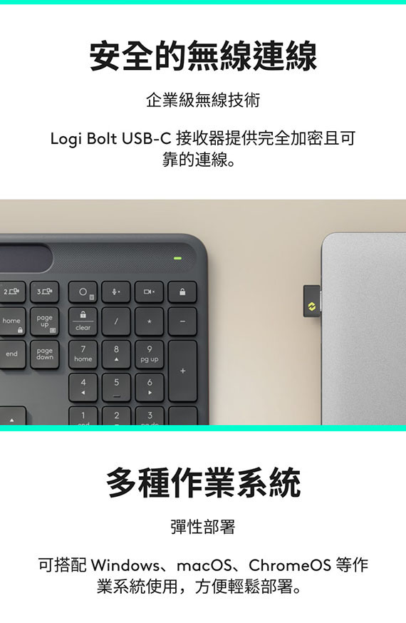 Logi Bolt USB-C接收器、藍牙低耗電技術(BLE),全尺寸,剪刀腳按鍵,一款光能供電的現代化鍵盤,任何光源都可以,可USB-C充電,Easy-Switch技術,108個按鍵,2年有限硬體保固(920-013783)