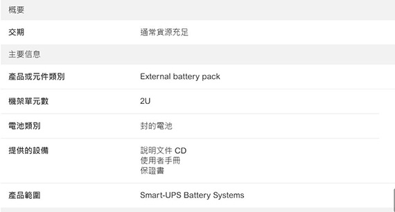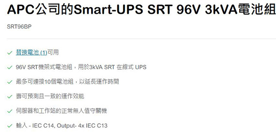 最多可連接10個電池組,延長運作時間,伺服器和工作站的正常無人值守關機,輸入-IEC C14, Output- 4x IEC C13,Smart-UPS SRT 96V 3kVA Battery Pack 直立式專用外接電池箱,2年保固