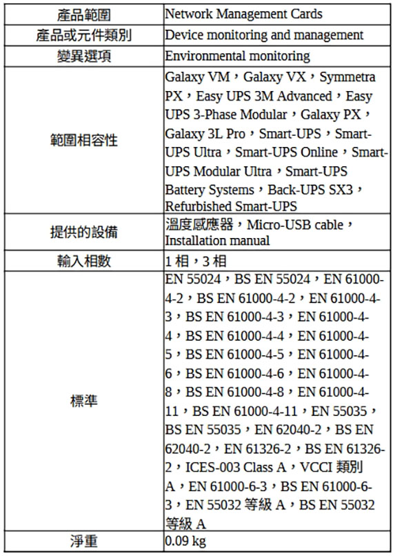 新具有環境監控功能網管卡,需另選購感應器AP9335T or AP9335TH,高度:3.8cm,寬度:12.1cm,深度:11.4cm,淨重:0.09kg,2年保固