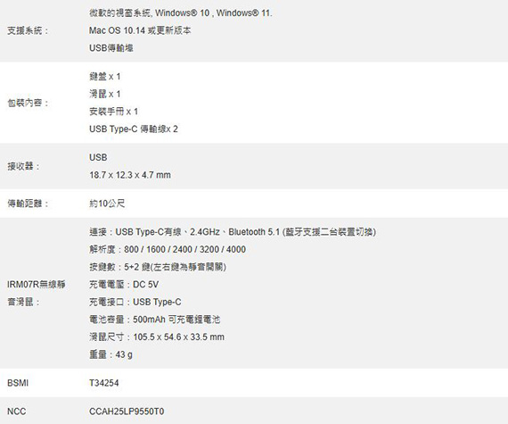 三模連接(無線2.4GHz、藍牙、Type-C有線),鍵盤:薄膜式,108鍵,輕薄靜音,高剪刀腳結構,2000mAh可充電鋰電池,3.8mm按鍵行程,按鍵壽命約1000萬次,滑鼠:無線靜音滑鼠,解析度:800/1600/2400/3200/4000,按鍵數:5+2鍵,500mAh可充電鋰電池,輕量舒適,小巧靜音,便商務攜帶,無線鍵鼠組合,鍵盤與滑鼠皆採用低噪設計,一年保固 NCC認證碼: CCAH25LP9550T0 BSMI認證碼: T34254