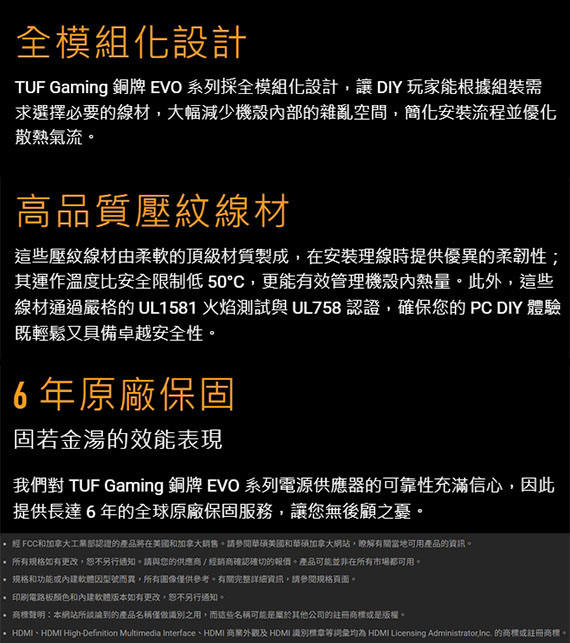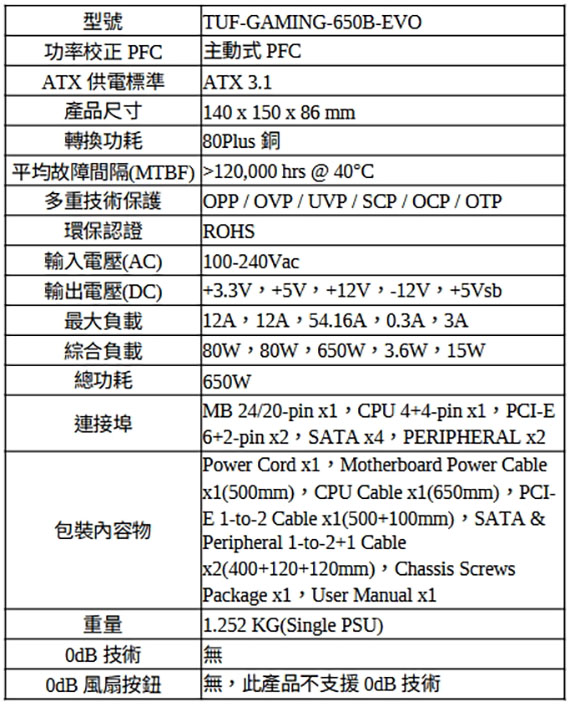 650W,80PLUS銅牌,雙滾珠軸承風扇,MB 24/20-pin*1,CPU 4+4-pin*1,PCI-E 6+2-pin*2,SATA*4,PERIPHERAL*2,電路板防護塗層,軍規認證,低內阻(Low-ESR)電解電容及頂級元件,全模組化設計,壓紋線材,6年保固