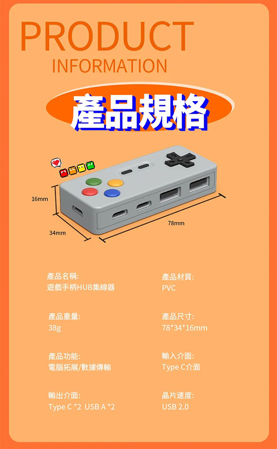 材質:PVC,輸入介面:Type C,輸出介面:Type C *2 USB A *2 ,晶片速度:USB 2.0