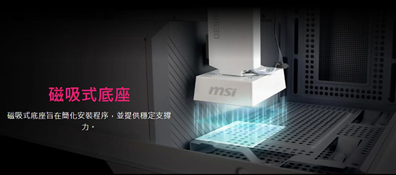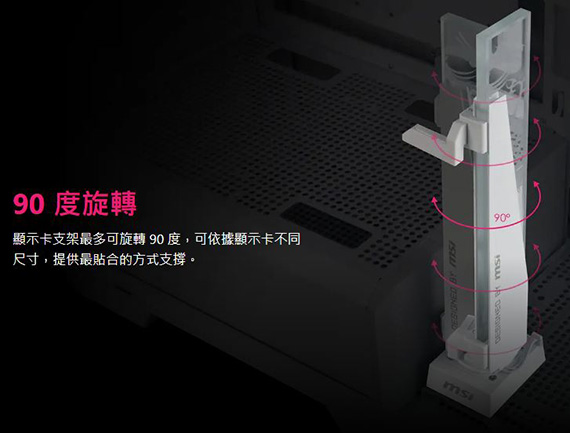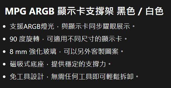 MPG ARGB 顯示卡支架,90 度旋轉,可適用不同尺寸的顯示卡,8mm強化玻璃可客製圖案,磁吸式底座,無需任何工具即可輕鬆拆卸,支撐高度:30~135mm(可調),重量310g,1年保固