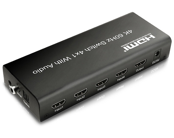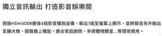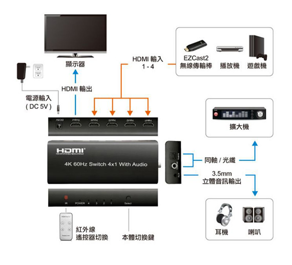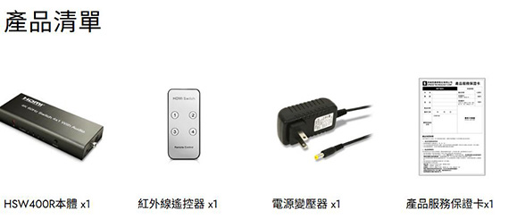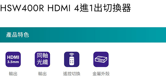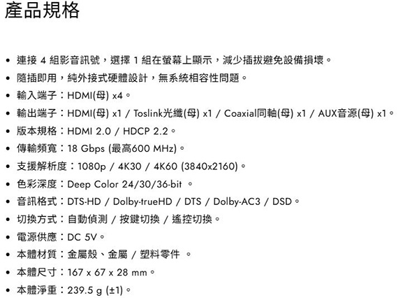 4進一出、支援HDMI 1.4b、支援3D視訊格式、支援數位光纖、同軸、3.5吋立體耳機孔音訊同步輸出、支援聲音取樣率30KHz、可用遙控器切換訊號、可透過數位光纖/同軸額外接擴大機或多聲道喇叭、全機屬機身