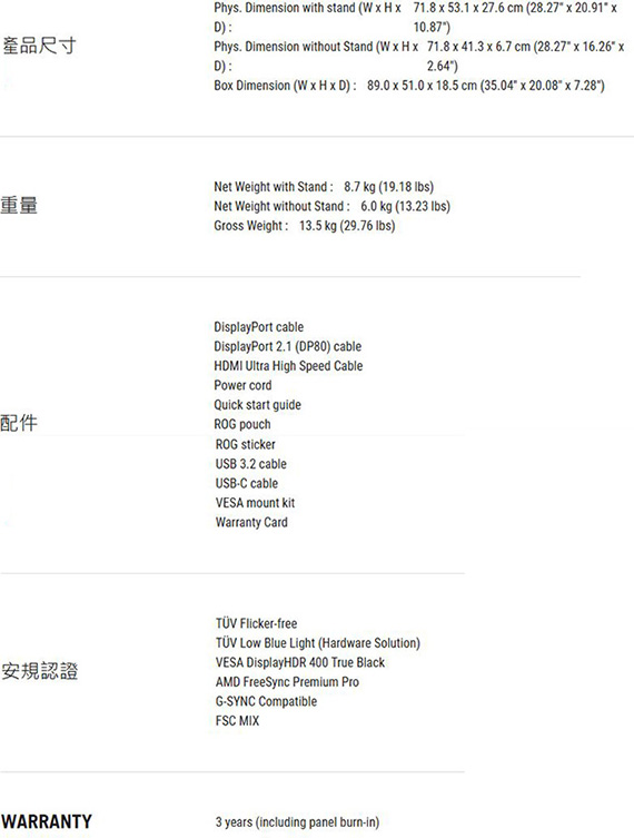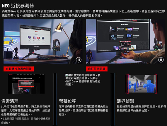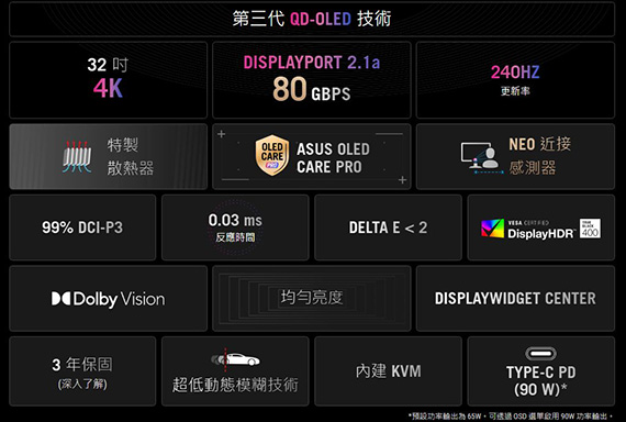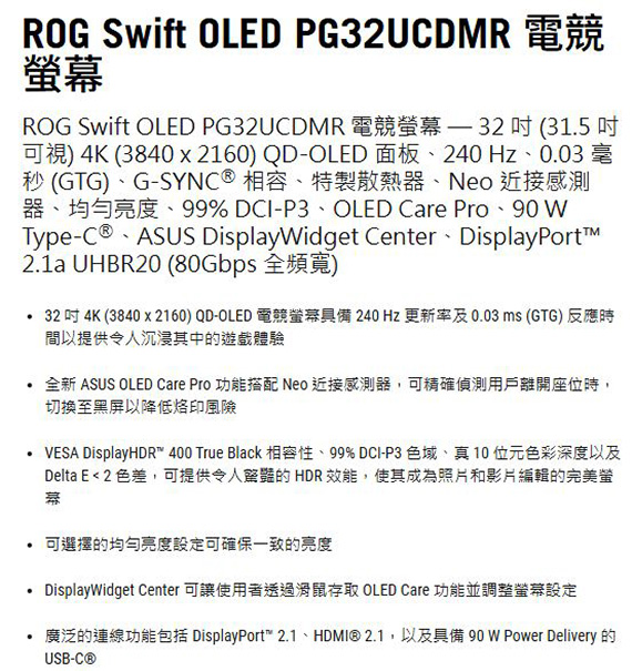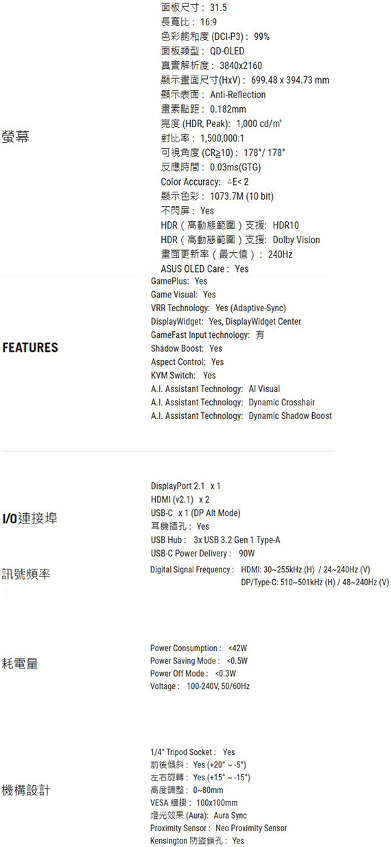 31.5吋、16:9寬螢幕、OLED面板、解析度 3840x2160(4K UHD/QFHD 2160P)、更新率240Hz、反應時間0.03ms、對比1500000:1、亮度250cd/m2、 輸入介面:HDMI(2.1)*2、DisplayPort(3.2)*1、USB-C*1(90W)、支援HDCP、Type-A USB3.2 Gen1*3、耳機孔、G-SYNC 相容,Neo 近接感測器, OLED Care Pro,99% DCI-P3