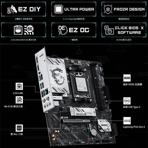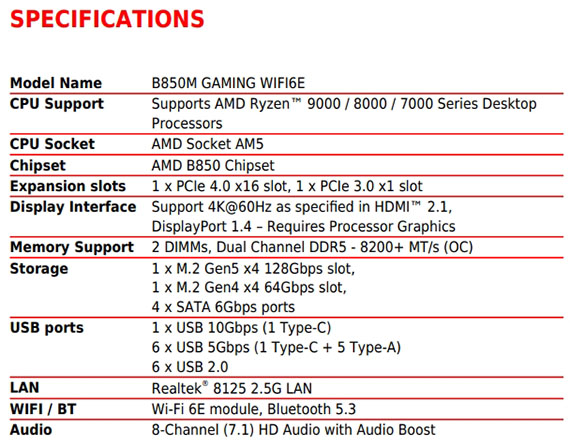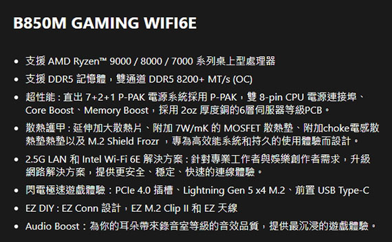 AMD B850,DDR5*2(MAX.128GB),8200-5600(OC)MT/s、5600-4800(JEDEC)MT/s,PCI-E x16 slot*1, PCI-E x1 slot*1,M.2*2,SATA 6G*4, HDMI2.1*1,DisplayPort1.4*1,Realtek 8125D 2.5G LAN,Wi-Fi 6E,藍牙5.3,Realtek ALC897,USB 2.0*2,Type A*3,Type C*1, mATX,Socket AM5,需搭配CPU晶片才能使用內顯功能