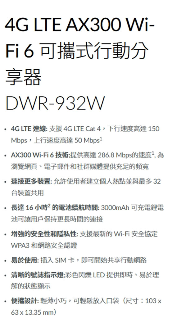 D-Link友訊 DWR-932W 4G LTE AX300 Wi-Fi 6 可攜式行動分享器