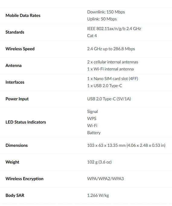 4G LTE傳輸,最高下載速率:150Mbps,最高上載速率:50Mbps,內建3000mAh鋰電池,16 小時電池續航力,內建Nano SIM插槽,最多可達32個裝置共享,USB2.0充電,WPA/WPA2/WPA3無線加密,尺寸:103*63*13.35mm,三年保固