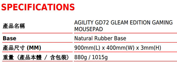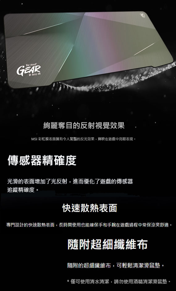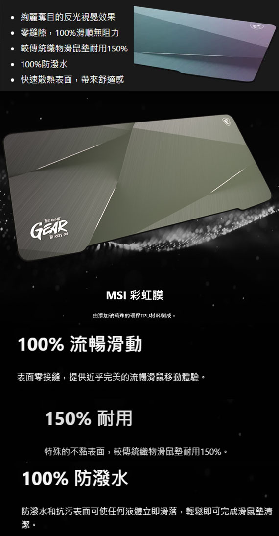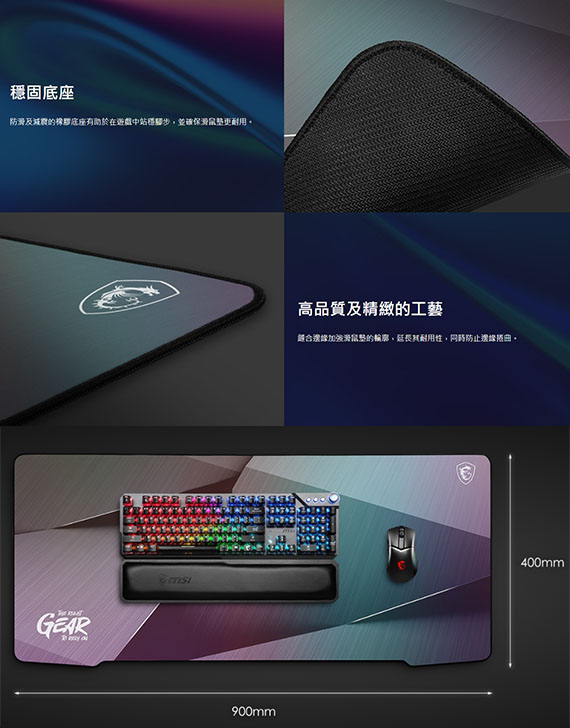 採用頂尖MSI彩虹膜表面、添絢麗奪目的反光視覺效果、零縫隙100%滑順無阻力、較傳統織物滑鼠墊耐用150%、100%防潑水、快速散熱表面、防滑及減震的橡膠底座、尺寸(LxWxH):900x400x3mm