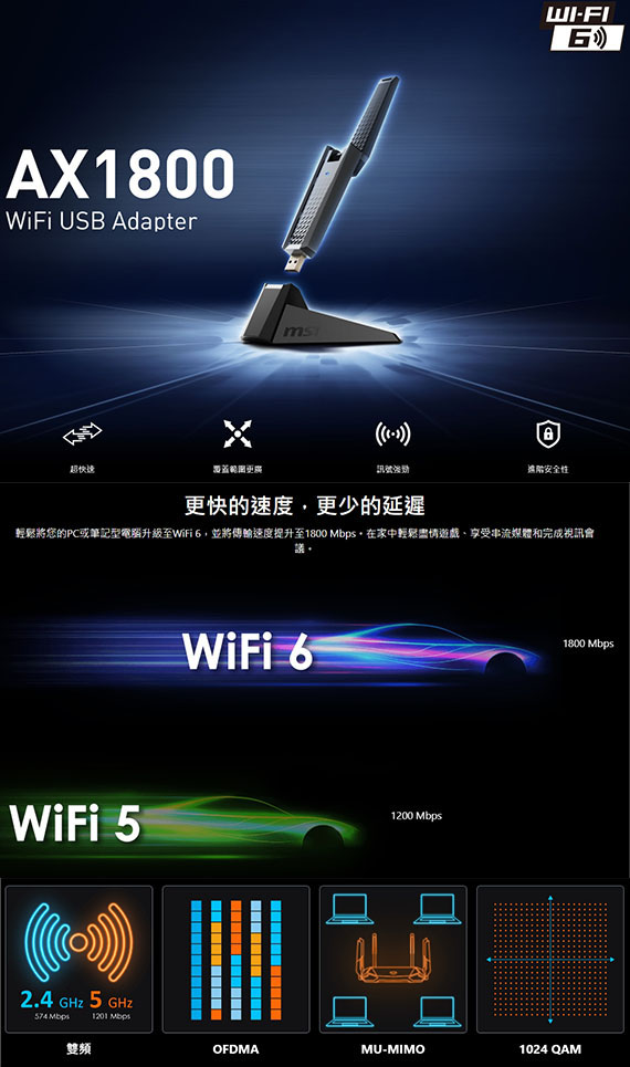 MSI微星 AX1800 USB Adapter 雙頻 WiFi 6 無線網路卡
