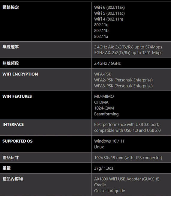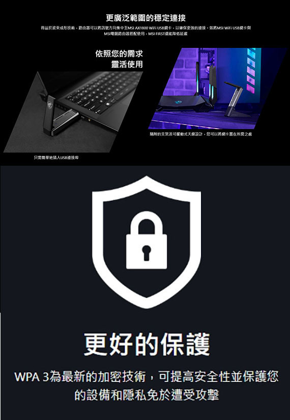 USB3.2 Gen1介面、雙頻傳輸速度高達1800Mbps、採用OFDMA、MU-MIMO和1024-QAM技術、編織電纜的支架及可擺動式天線設計、WPA3加密技術、支援多種操作系統 NCC認證碼: CCAH22LP7210T4