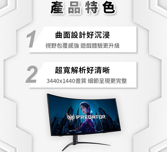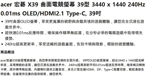 Acer宏碁 X39 39型 21:9 39吋 2K 240Hz電競曲面螢幕 (OLED/0.01ms/2H1DP1Type-C/喇叭/HDR400)