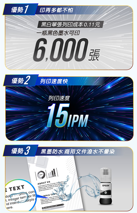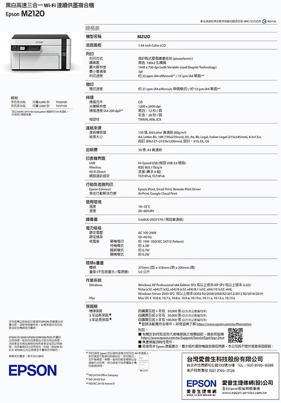 A4,無線/USB/列印/影印/掃描/傳真,列印解析度:1440x720 速度:黑白32ppm(MAX),影印 黑白13ppm,掃描:解析度1200x2400dpi,無線WI-FI,不需透過AP也可連線列印,1.44吋彩色螢幕,耗材:(T03Q)黑/(T01P)黑,保固一年