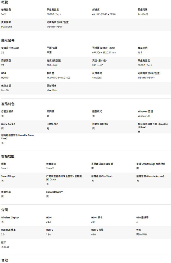 31.5吋,16:9寬螢幕,LED,VA面板,解析度3840x2160(4K UHD),反應時間4ms(GTG),對比3000:1,亮度300cd/m2,輸入介面:HDMI(2.0)*2,支援HDCP,Type-C*1(65W充電), USB2.0*3埠 Hub, 內建喇叭,壁掛裝置(VESA),藍牙5.2,WiFi5, 內建智慧電視,可觀賞各串流應用程式,遠端存取功能,60Hz刷新率 NCC認證碼: CCAO20Y10060T5