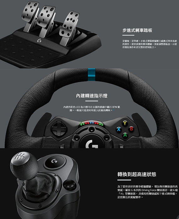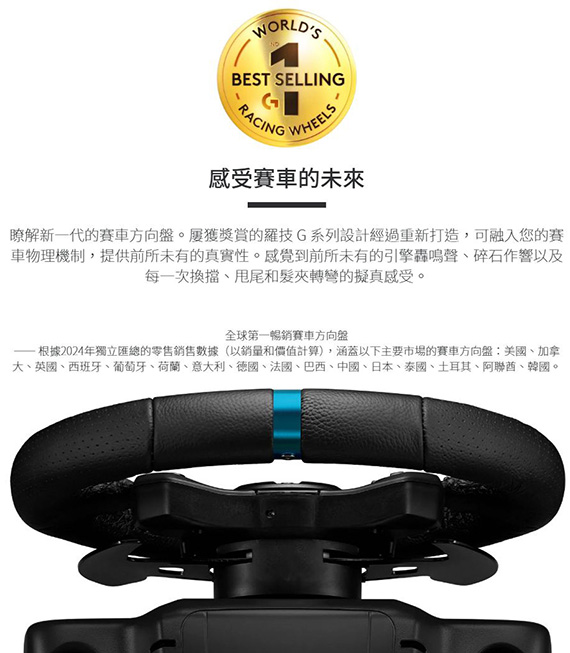 反饋技術模擬引擎,可融入您的遊戲物理提供前所未有的真實感,在支援的遊戲中可編程的雙離合器啟動輔助裝置,內置的彩色LED,支援G HUB自定義,汽車風格的手工縫製皮革,拉絲金屬拋光的踏板,包裝內容:方向盤+踏板(941-000154)