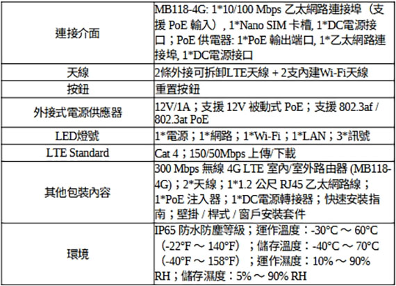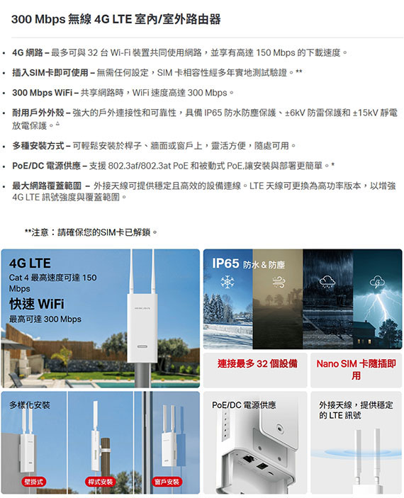 4G 網路,插入SIM卡即可使用,300 Mbps WiFi,可連接32台設備,多種安裝方式,IP65防水防塵,多種安裝方式和耐用設計