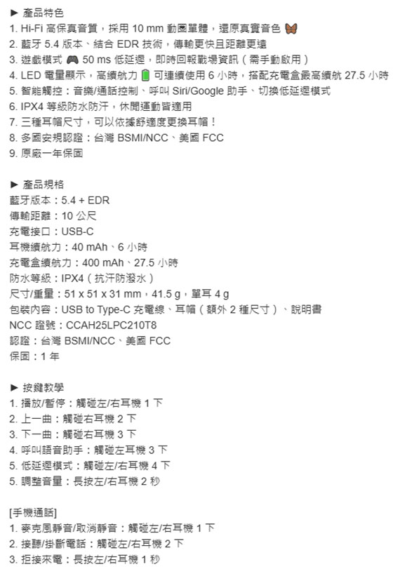 入耳式(耳道),驅動單元10mm,藍牙5.4+EDR,Type-C充電介面,耳機續航力:40mAh、6小時,防水等級:IPX4(抗汗防潑水),遊戲模式,LED電量顯示,搭配充電盒最高續航27.5小時,智能觸控,原廠一年保固 NCC認證碼: CCAH25LPC210T8 BSMI認證碼: R37846