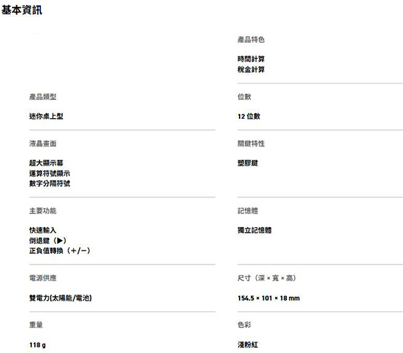 12位數,29按鍵,超大顯示幕,10種顏色,圓滑外型,斜線點綴凸顯特色,多層次構造設計 握持更容易方便,扁鍵圓角 操作舒適,傾斜式LCD表面數字呈現更清晰,獨立記憶體,正負值轉換(+/-),倒退鍵,基本計算,百分比計算,利潤百分比,根號計算,時間計算,稅金計算,雙電力(太陽能/電池),尺寸(深寬高):154.5×101×18mm,重量118g,二年保固 BSMI認證碼: D33C78