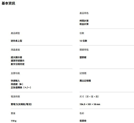 12位數,29按鍵,超大顯示幕,10種顏色,圓滑外型,斜線點綴凸顯特色,多層次構造設計 握持更容易方便,扁鍵圓角 操作舒適,傾斜式LCD表面數字呈現更清晰,獨立記憶體,正負值轉換(+/-),倒退鍵,基本計算,百分比計算,利潤百分比,根號計算,時間計算,稅金計算,雙電力(太陽能/電池),尺寸(深寬高):154.5×101×18mm,重量118g,二年保固 BSMI認證碼: D33C78