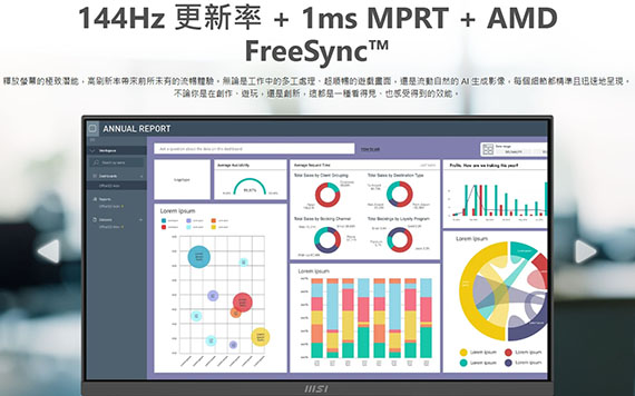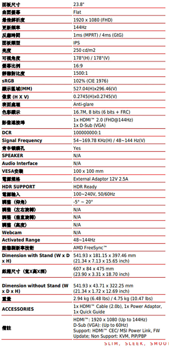 23.8吋,16:9寬螢幕,IPS面板,解析度1920x1080(FHD),更新率144Hz,反應時間1ms(MPRT),對比1500:1,亮度250cd/m2,輸入介面:D-Sub(VGA)*1,HDMI2.0*1,TUV認證的顯示器保護視力,MSI EyesErgo 技術搭配防閃爍技術,MSI Eye-Q Check 功能可自我檢查眼睛,並在長時間使用顯示器時提醒您休息,便捷可拆的線纜管理設計,支援MSI Power Link,標準VESA安裝和配件插槽設計
