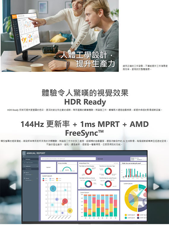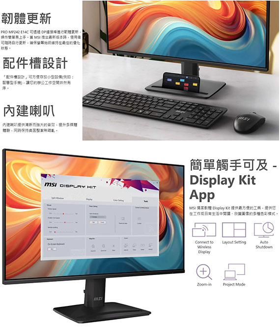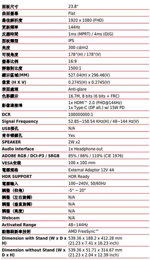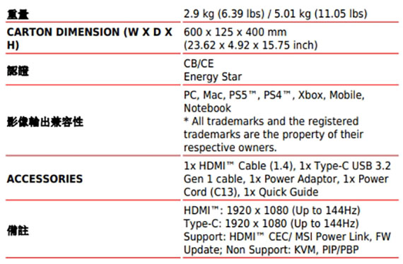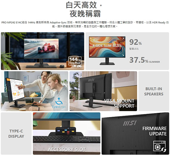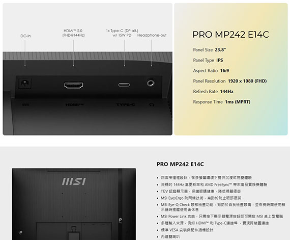 23.8吋,16:9寬螢幕,IPS面板,解析度1920x1080(FHD),更新率144Hz,反應時間1ms(MPRT),對比1500:1,亮度300 cd/m2,輸入介面:HDMI2.0*1,Type-C*1,Headphone-out*1,內建雙喇叭,四面窄邊框設計,在多螢幕顯示器中盡情享受沉浸式體驗,TUV認證的顯示器、保護視力,MSI EyesErgo 防閃爍技術,MSI Eye-Q Check 眼部檢查功能有助於自我檢查眼睛,在長時間使用顯示器時提醒使用者休息,MSI Power Link 功能,標準VESA安裝,配件插槽設計