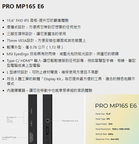 MSI微星 PRO MP165 E6 16型 16:9 15.6吋 攜帶式螢幕 (IPS/4ms/60Hz/1H2C/EyesErgo)