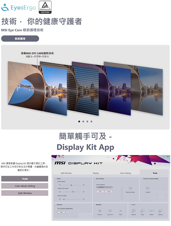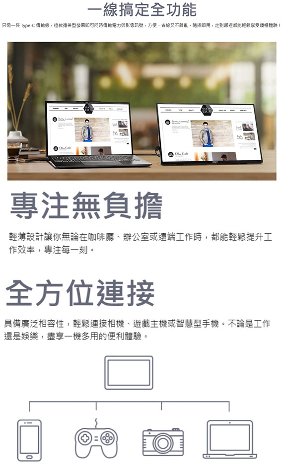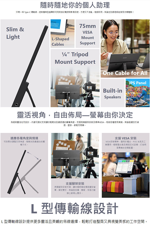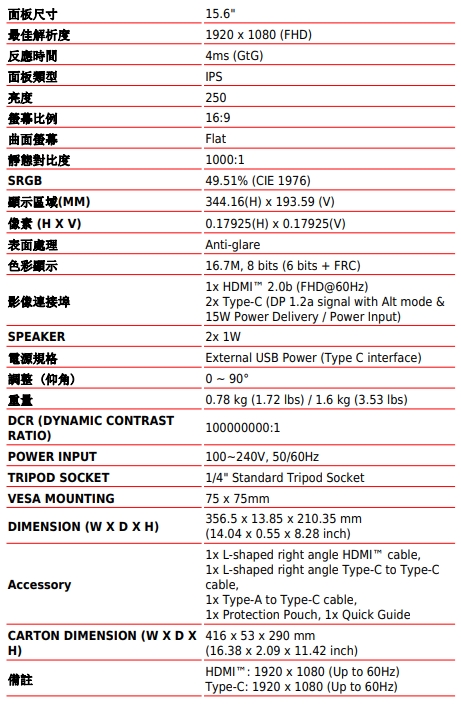 15.6吋,16:9寬螢幕,IPS面板,解析度1920x1080(FHD),更新率60Hz,反應時間4ms(GtG),對比1000:1,亮度250cd/m2,輸入介面:Type-C*2,HDMI(2.0b)*1,支援HDCP,壁掛裝置(VESA),MSI EyesErgo 技術具有防閃爍、減藍光和防眩光設計,MSI Eye-Q Check可協助自我檢查眼睛並提醒長時間使用顯示器時休息, 三腳支撐架設計,便攜式設計,輕薄外型,L 型線材設計可防止線材彎曲,確保使用方便且不易斷,符合人體工學的軟體「Display Kit」為您提供最方便的工具、適合的顏色和顯示模式
