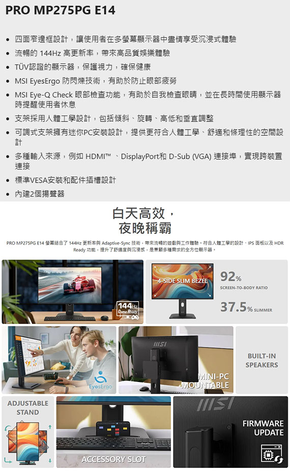MSI微星 PRO MP275PG E14 27型 16:9 27吋 螢幕 (IPS/1ms/144Hz/1A1H1DP/喇叭/EyesErgo技術/可升降、傾斜和垂直旋轉)