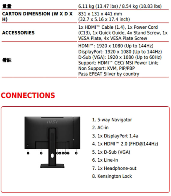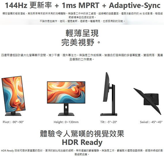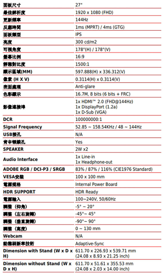 27吋,16:9寬螢幕,IPS面板,解析度1920x1080(FHD),更新率144Hz,反應時間1ms(MPRT),對比1500:1,亮度300 cd/m2,輸入介面:DisplayPort 1.4a*1,D-Sub(VGA)*1,HDMI2.0*1,Line-in*1,Headphone-out*1,內建2個揚聲器,HDR Ready 技術,四面窄邊框設計,多螢幕顯示器中盡情享受沉浸式體驗,TUV認證的顯示器、保護視力,MSI EyesErgo 防閃爍技術,MSI Eye-Q Check 眼部檢查功能助於自我檢查眼睛,長時間使用顯示器時提醒使用者休息,支架採用人體工學設計,可調式支架擁有迷你PC安裝設計,標準VESA安裝,配件插槽設計
