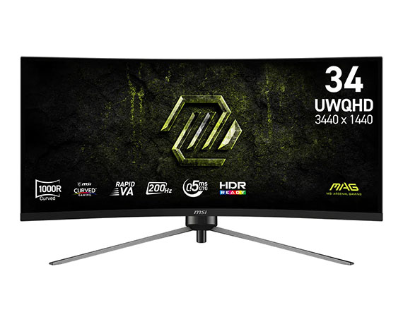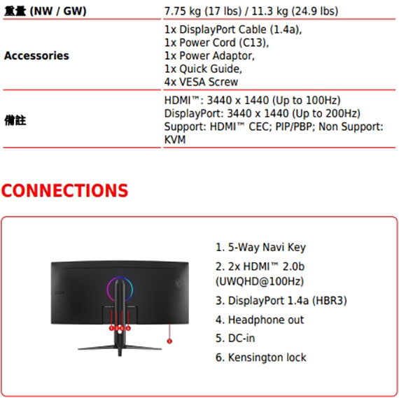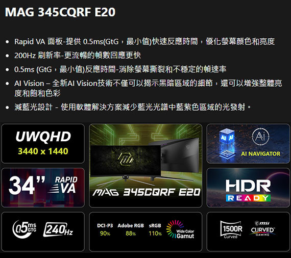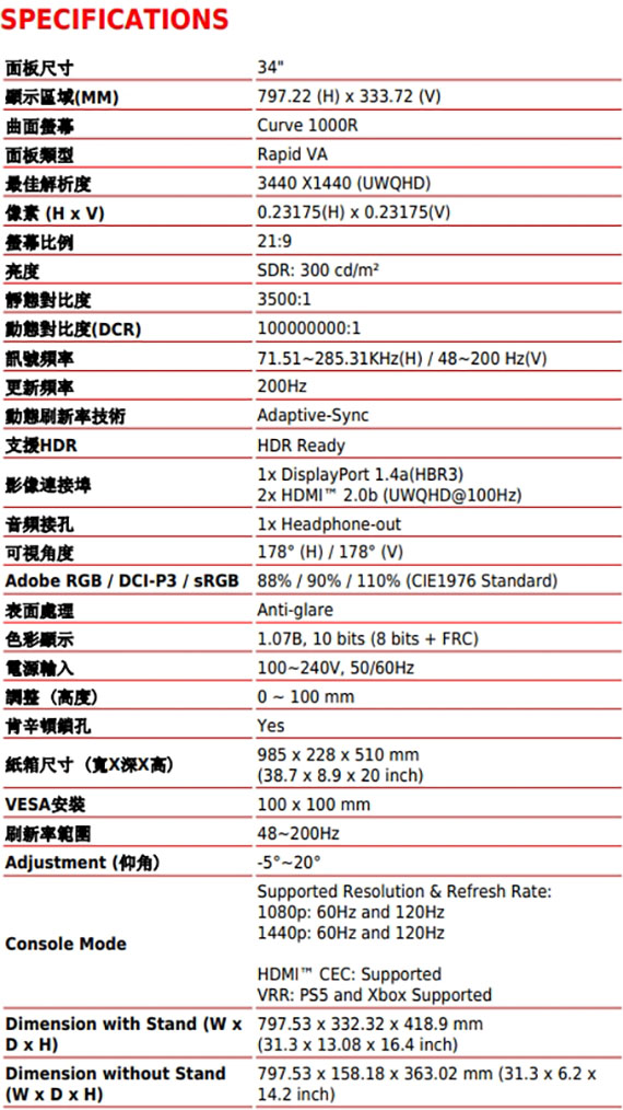 34吋,螢幕比例21:9,VA 面板,曲面螢幕1000R曲率,解析度3440X1440(UWQHD),更新頻率200Hz,0.5ms(GtG Min)反應時間,對比度100000000:1,亮度SDR:300 cd/m2,介面:DisplayPort1.4a*1、HDMI*2,支援HDCP,全新AI Vision技術,減藍光設計