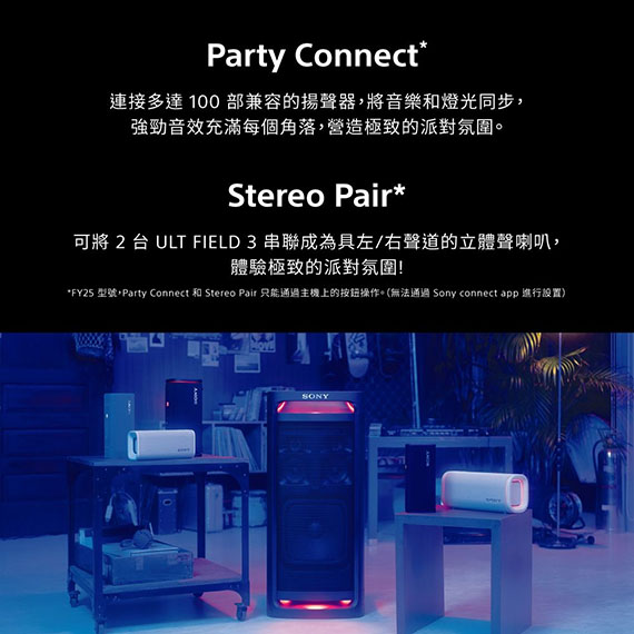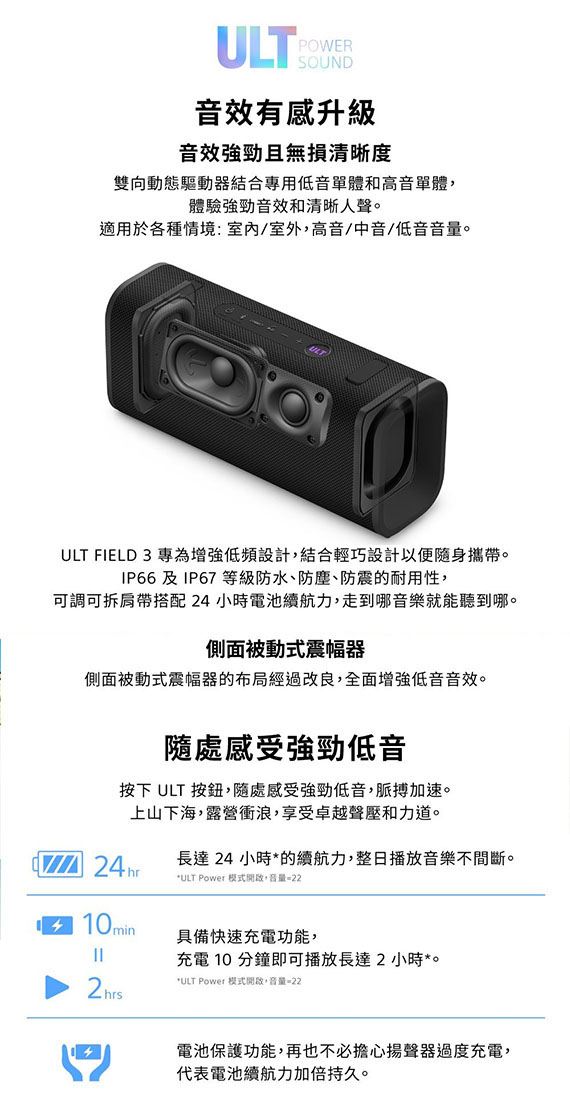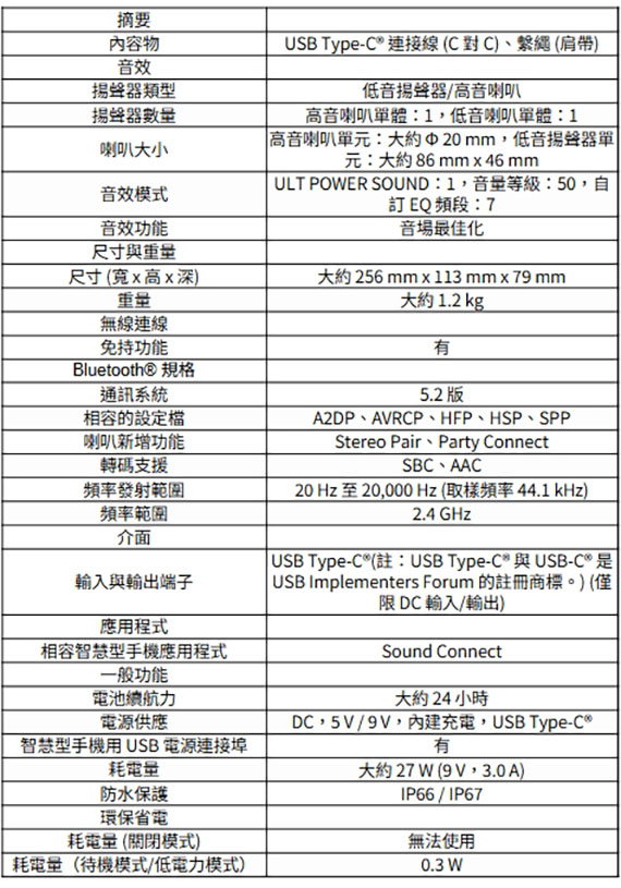 藍牙Bluetooth 5.2版,低音揚聲器/高音喇叭,高音喇叭單體x1,低音喇叭單體x1,音效模式 ULT POWER SOUND:1,音量等級:50,自訂EQ頻段:7,高音喇叭單元:大約20mm,低音揚聲器單元:大約86x46mm,喇叭新增功能 Stereo Pair、Party Connect,2.4GHz無線技術,尺寸(寬x高x深):256x113x79mm,重量:1.2kg,耗電量約27W,使用電源:DC 5 V/9 V,內建充電,USB Type-C充電,電池續航力約24小時,防水/防撞/防塵, IP66/IP67,強勁低音、一手掌握,7 波段均衡器自選音效設定,隨附肩帶輕鬆出行,環保省電 NCC認證碼: CCAO24LP1040T9