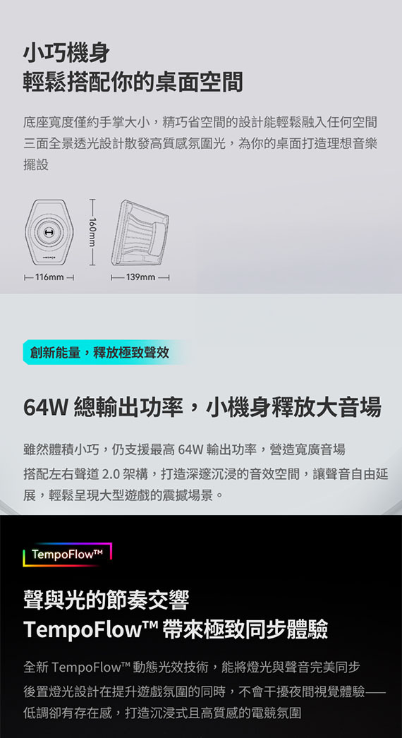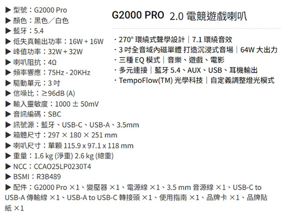 3吋全音域內磁單體,多元連接:藍牙5.4、USB-C、USB-A、3.5mm,低失真輸出功率:16W+16W,峰值功率:32W+32W,TempoFlow(TM)光學科技 NCC認證碼: CCAO25LP0230T4 BSMI認證碼: R3B489