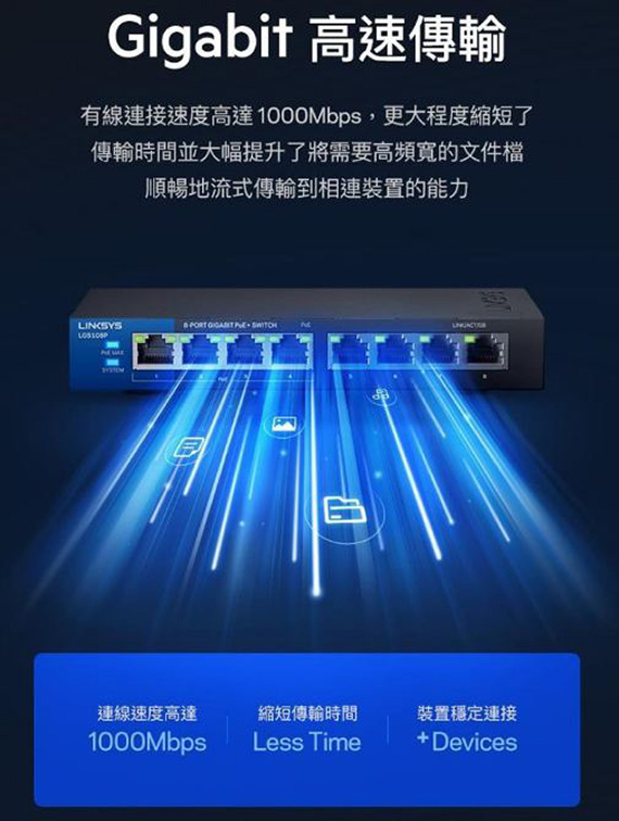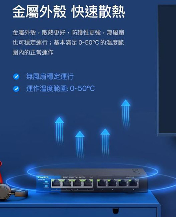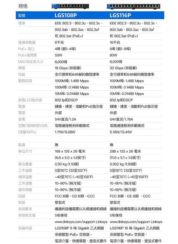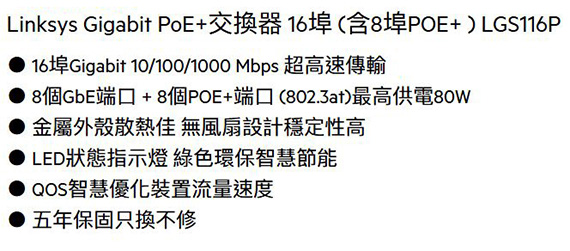 提供16*10/100/1000BASE-T RJ45連接埠,8個GbE端口+8個POE+端口(802.3at)最高供電80W,金屬外殼散熱佳,無風扇設計,隨插即用,LED狀態指示燈,綠色環保智慧節能, QOS智慧優化裝置流量速度,電纜連接檢測休眠模式,尺寸:288*132*26mm,五年保固,製造地:中國