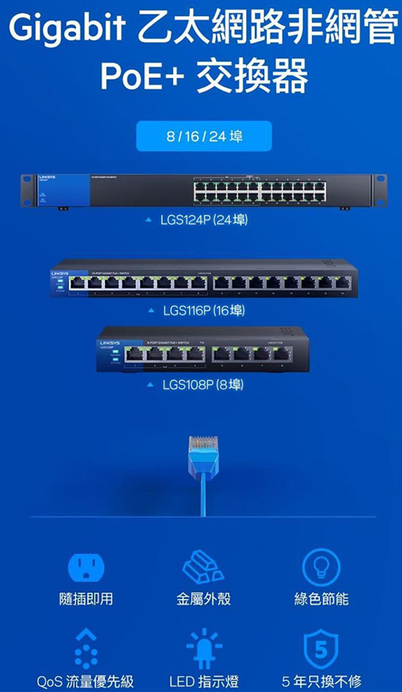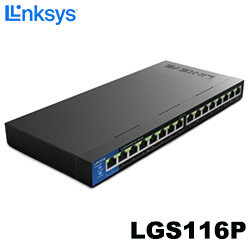 Linksys LGS116P 16埠 Gigabit乙太網路非網管PoE+交換器LGS116P-AP