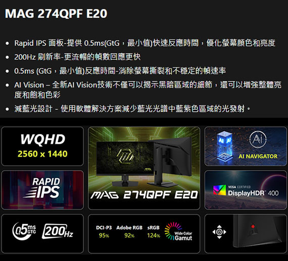 MSI微星 MAG 274QPF E20 27型 16:9 27吋 電競螢幕(IPS/0.5ms/200Hz/2H1DP1C)