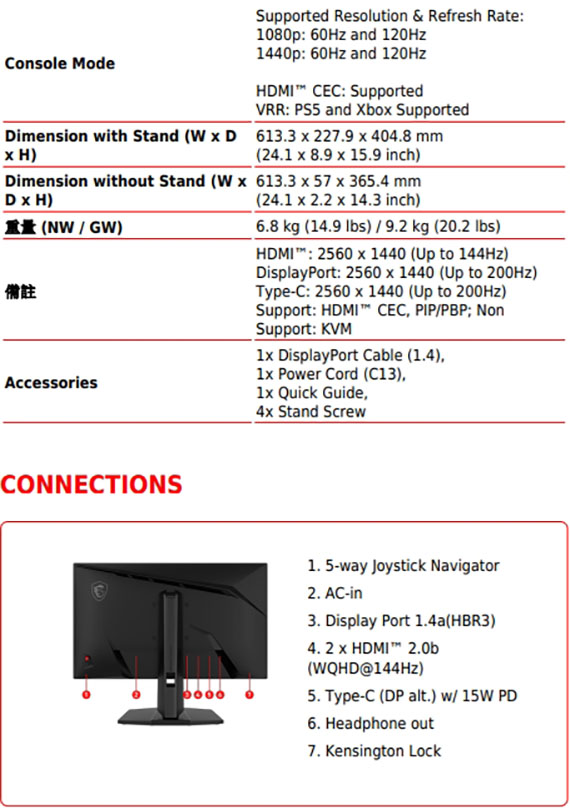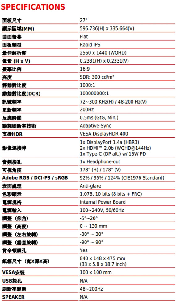 27吋,螢幕比例16:9,IPS面板,2560*1440(WQHD)解析度,更新頻率200Hz,0.5ms(GtG, Min.),靜態對比度1000:1,動態對比度(DCR)100000000:1, 亮度SDR:300 cd/m2,介面:DisplayPort 1.4a*1、HDMI 2.0b*2、Type-C*1,支援HDCP,全新AI Vision技術,減藍光設計