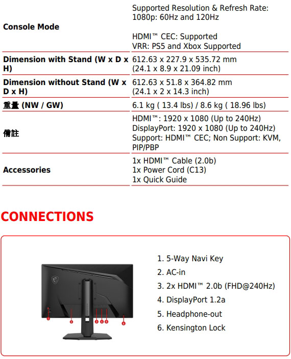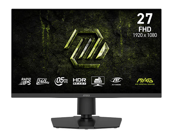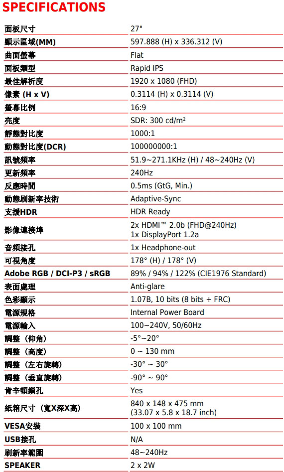 27吋,螢幕比例16:9,IPS面板,解析度1920*1080(FHD),更新頻率240Hz,0.5ms反應時間,靜態對比度1000:1,動態對比度(DCR)100000000:1, 亮度SDR:300cd/m2,介面:HDMI 2.0b*2、DisplayPort 1.2a*1,支援HDCP,防閃爍減藍光設計