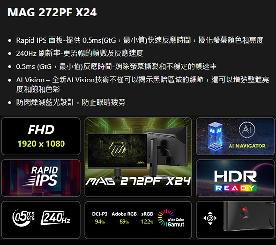 MSI微星 MAG 272PF X24 27型 16:9 27吋 電競螢幕(IPS/0.5ms/240Hz/2H1DP)