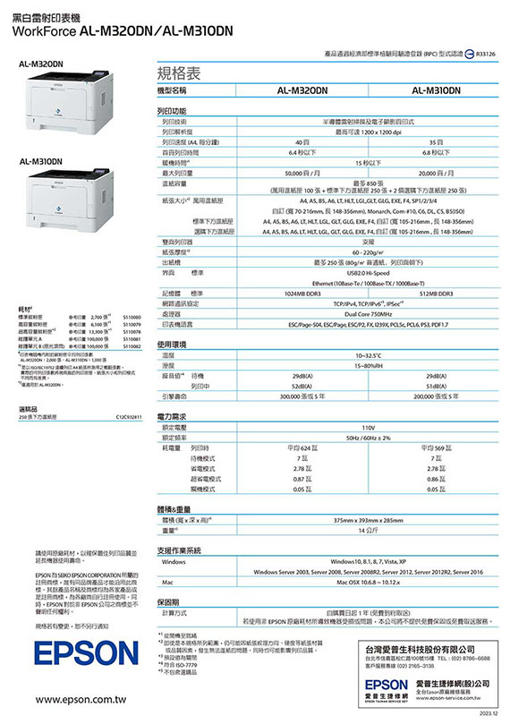 A4,自動雙面/網路列印,列印1200x1200dpi,速度:黑白35ppm,處理器速度750MHz,記憶體:512MB,USB 2.0,乙太網路,耗材:S110080/S110079高容量/S110078超高容量