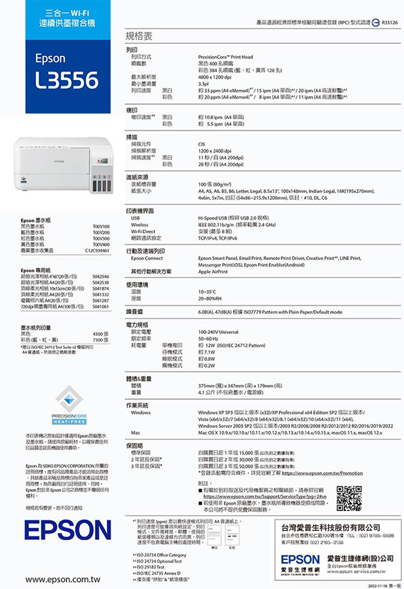 A4, 無線/行動裝置/雲端 列印。列印/影印/掃瞄。列印4800x1200dpi,速度:黑白15ppm/彩色8ppm。影印速度:黑白10.8cpm/彩色5.5cpm。掃描1200x2400dpi,CIS。紙張處理進紙量100頁。USB2.0, Wireless 2.4GHz, Wi-Fi Direct, Apple AirPrint,搭配Epson Smart Panel智慧遙控行動App。耗材: T00V100黑色,T00V200藍色,T00V300紅色,T00V400黃色,C12C934461廢氣墨水收集盒,1年保固