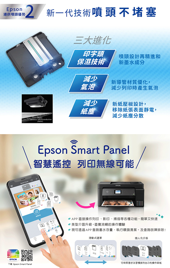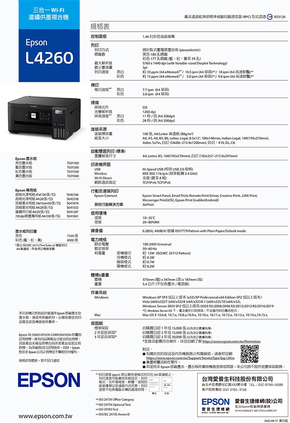 A4,連續供墨系統,無線/行動裝置/雲端列印,列印/影印/掃描/自動雙面列印,列印5760x1440dpi,黑白33ppm/彩色15ppm,影印:黑白7.7ipm/彩色3.8ipm,掃描(CIS)1200dpi,速度:黑白11秒/彩色28秒,USB 2.0,Wi-Fi Direct,耗材:T03Y100黑/T03Y200藍/T03Y300紅/T03Y400黃