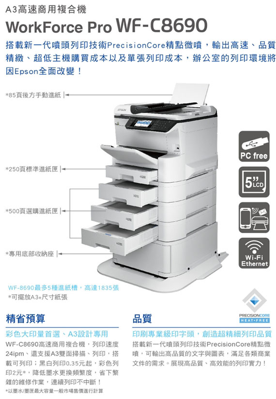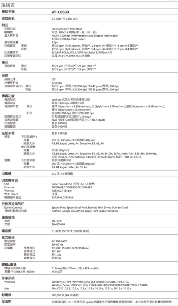 A3,網路/無線/行動裝置/雲端 列印,列印/影印/掃描/傳真;列印4800x1200dpi,速度:黑白35ppm/彩色35ppm;影印速度:黑白22ipm/彩色21ipm;掃描(CIS/饋紙式ADF)1200dpi,速度:黑白25ppm/彩色25ppm;黑白和彩色傳真,每頁約3秒 ,6MB記憶體可達550頁;USB 3.0,Wi-Fi Direct,乙太網路,5.0吋彩色螢幕,耗材:T01A1黑高容量/T01A2藍高容量/T01A3紅高容量/T01A4黃高容量