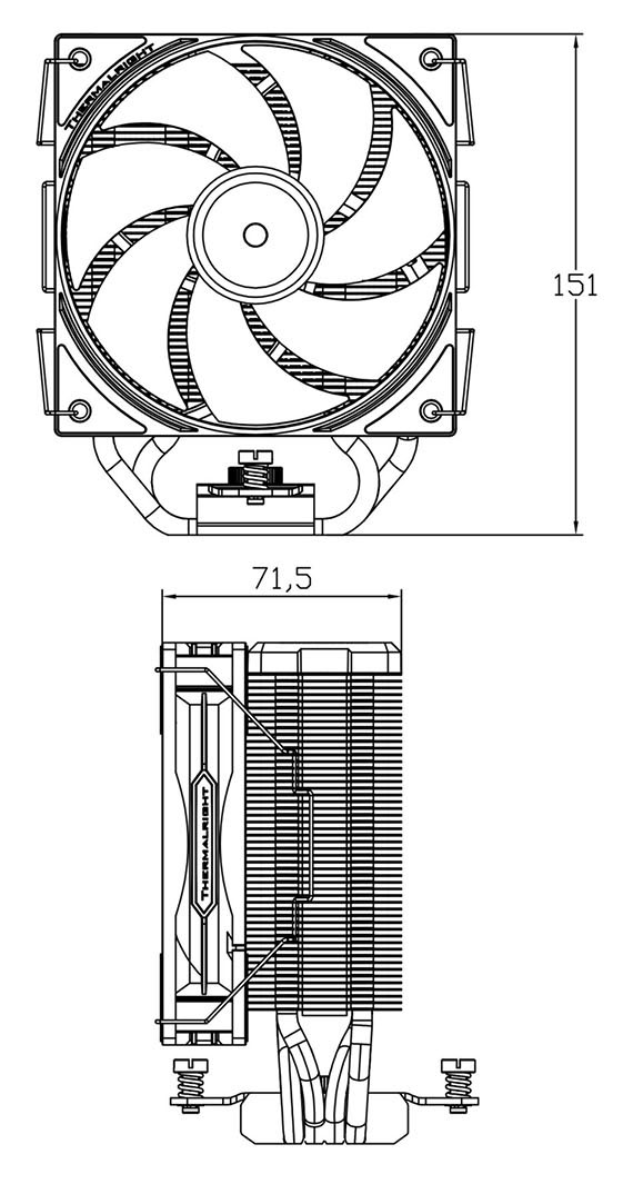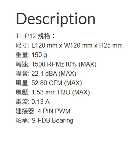Intel:LGA115X/1200/1700/1851、AMD:AM4/AM5、TL-P12風扇尺寸120x120x25mm、風量70.84CFM、轉速2000RPM±10%、噪音值29.8dBA、靜壓2.63mm-H2O、散熱器尺寸(含扇):120x46x151mm、4Pin PWM接頭、6mm熱管×4支、數位顯示面版、ARGB數位顯示支援溫控色變