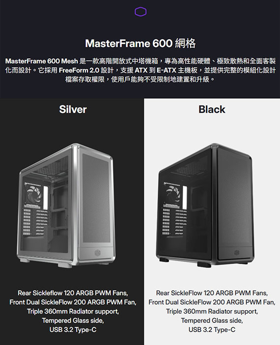 CoolerMaster MasterFrame 600 Mesh 黑色 強化玻璃透側 ARGB ATX機殼 支援背插式主機板 (MF600M-KGNN-S01)